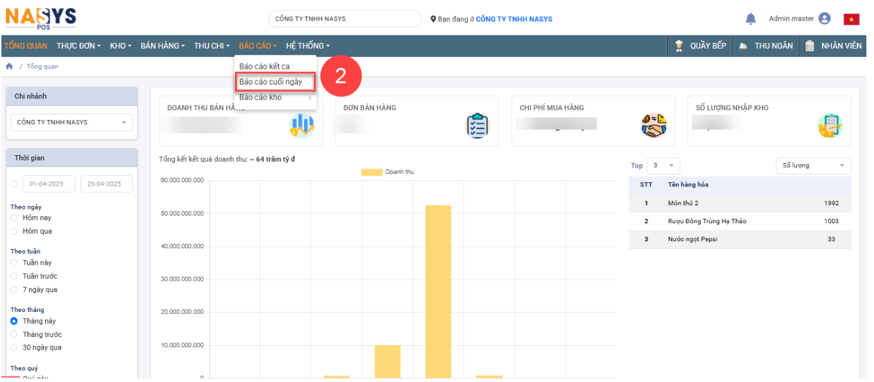 Bước 2: NSD chọn vào chức năng “Báo báo cuối ngày”