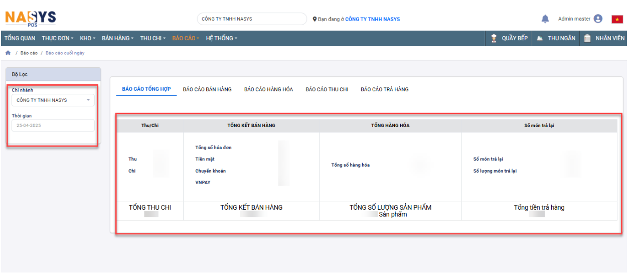 Chức năng xem báo cáo cuối ngày, mục đích để xem báo cáo doanh thu tổng hợp, bán hàng, hàng hóa, thu chi, trả hàng