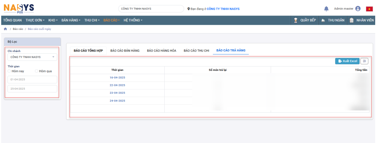 Hình minh họa xem báo cáo trả hàng cuối ngày