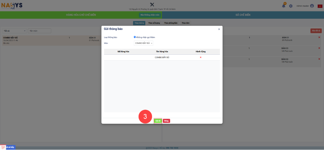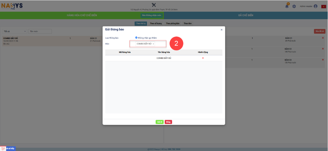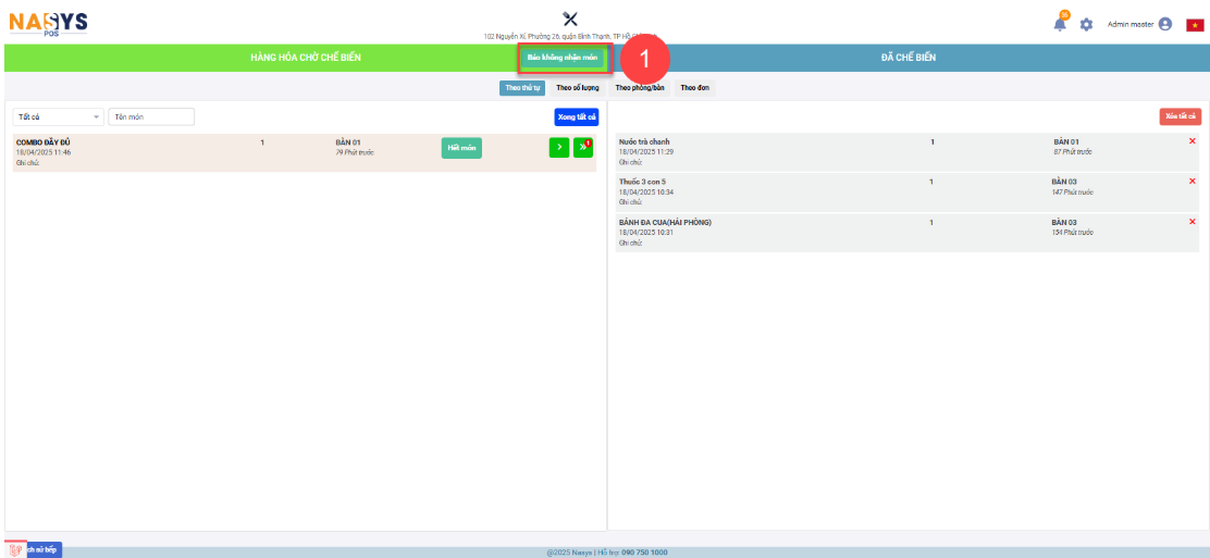 Chức năng cho phép bộ phận bếp/bar thực hiện thao tác báo không nhận món những món không đủ số lượng nguyên chế biến. Thu ngân, nhân viên, quản lý sẽ nhận thông báo hết món sau khi thông báo được gửi đi