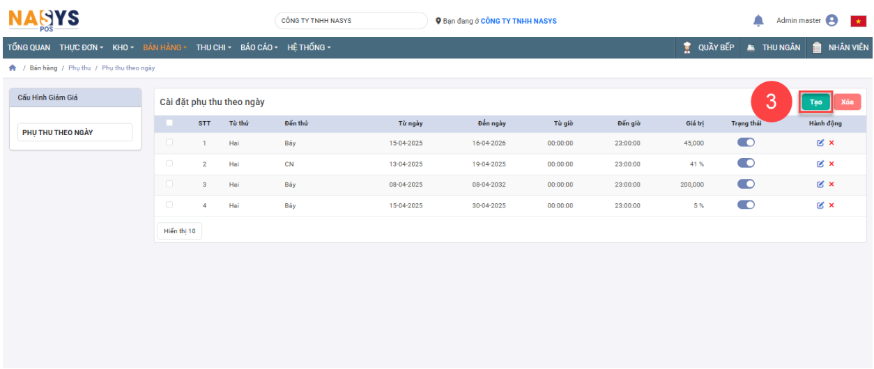 Hình minh họa hiển thị thao tác click tạo mới phụ thu