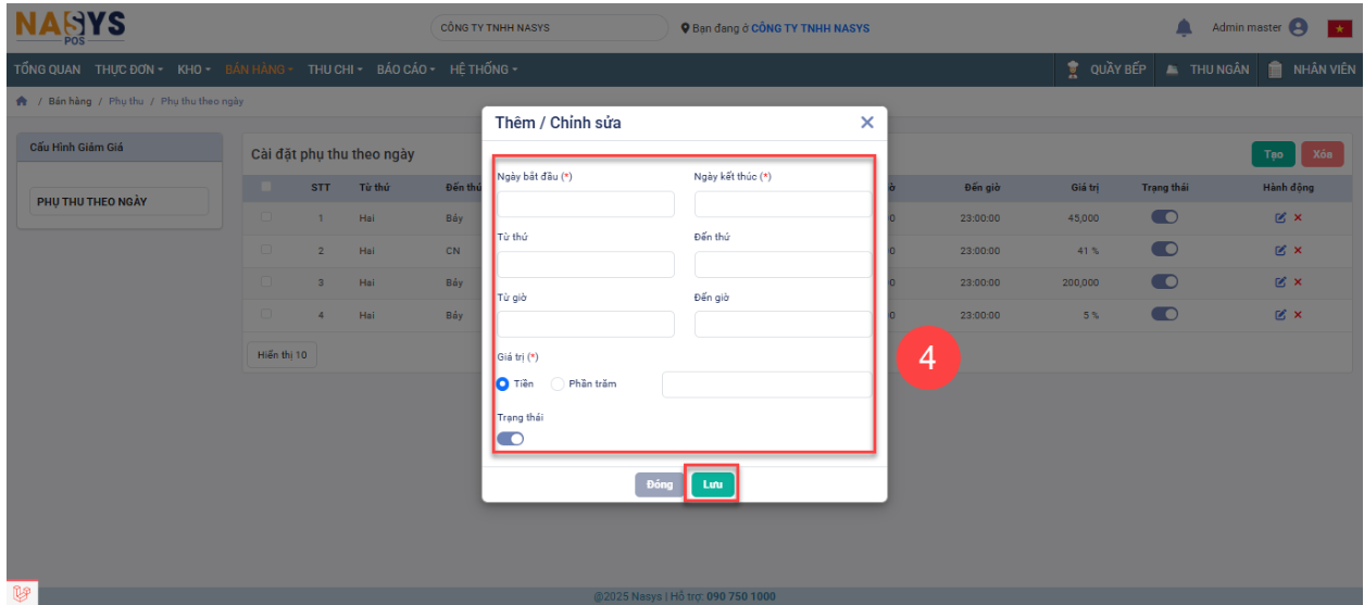 Bước 4: NSD nhập thông tin tạo phụ thu và click lưu thông tin