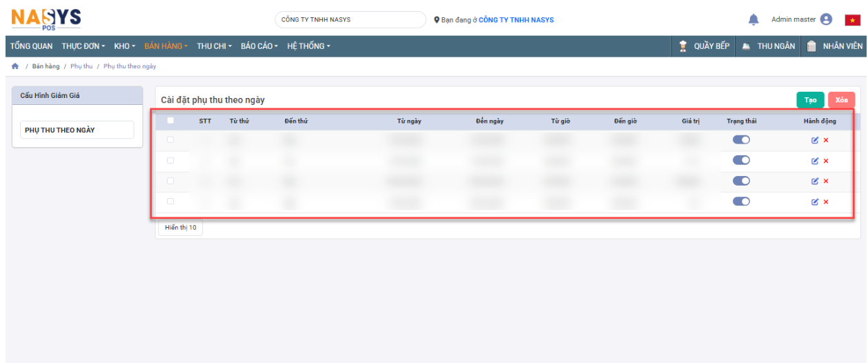 Bước 5: Danh sách phụ thu sau khi thêm thành công