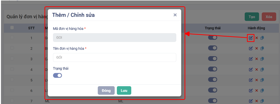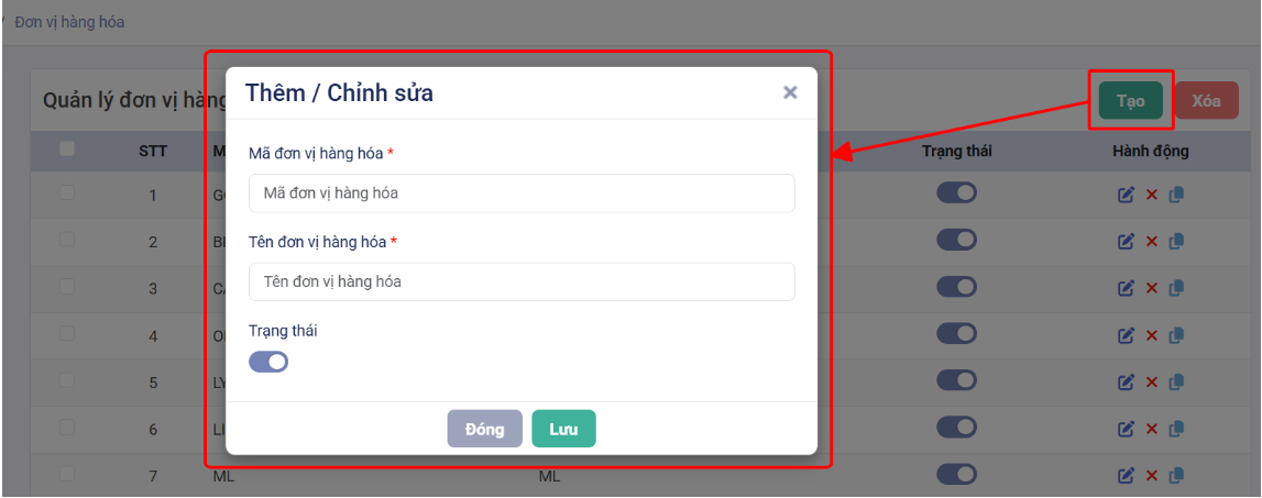 - Tạo mới: Chọn nút “Tạo”, nhập thông tin Đơn vị tính, chọn “Lưu” để tạo Đơn vị tính