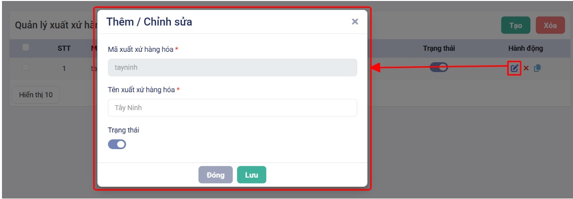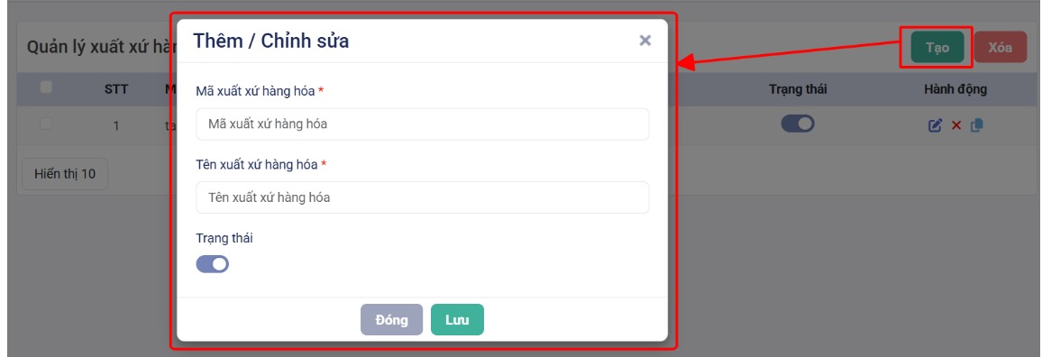 - Tạo mới: Chọn nút “Tạo”, nhập thông tin Xuất xứ, chọn “Lưu” để tạo Xuất xứ