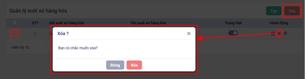 - Xóa 1: Chọn Xuất xứ muốn xóa, chọn