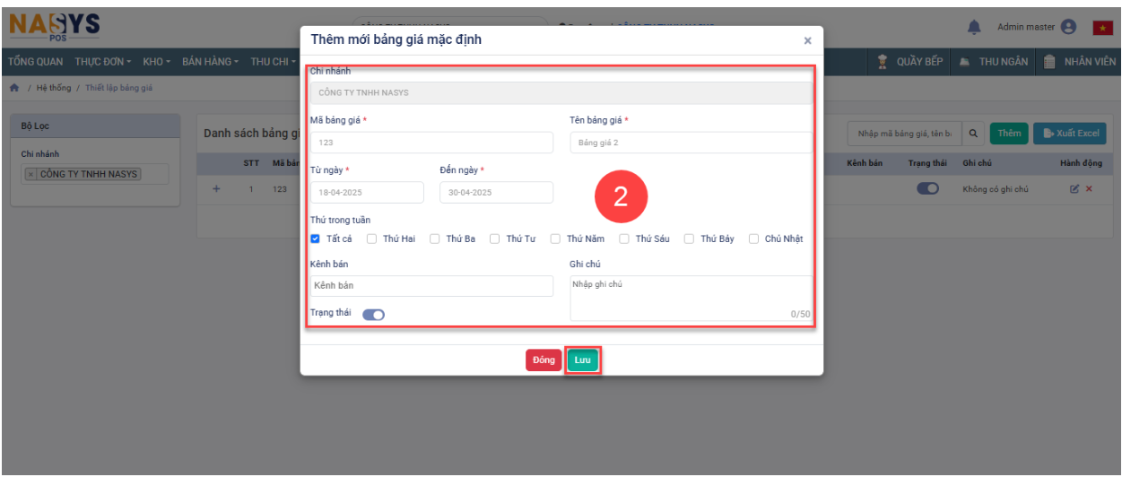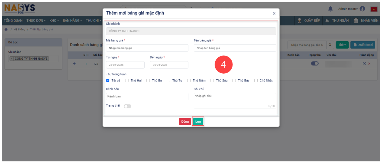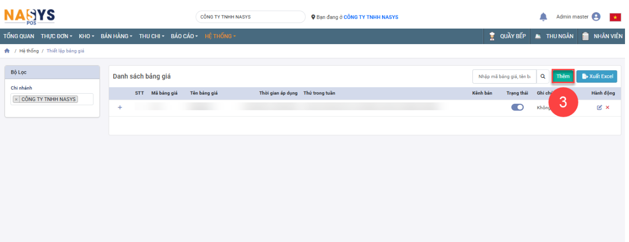 Lưu ý: Khi khởi tạo thì sẽ không cho phép tạo trùng bảng giá cùng thời gian nếu cùng 1 chi nhánh