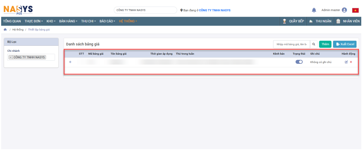 Bước 5: Danh sách bảng giá sau khi khởi tạo thành công
