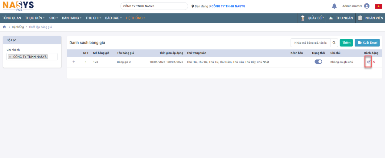 Bước 1: NSD chọn vào bảng giá cần sửa và click sửa