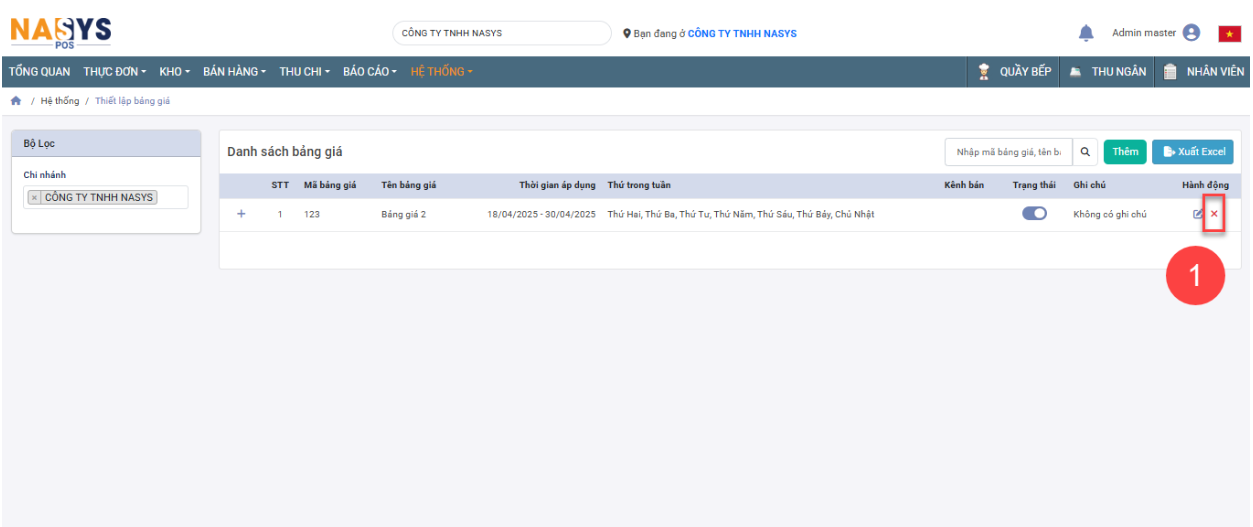 Bước 1: NSD chọn vào bảng giá cần xóa và click “Xóa”