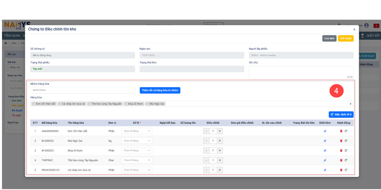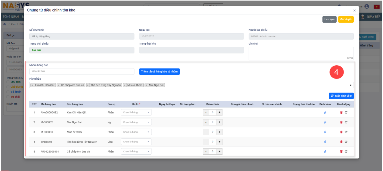 Bước 4: Tìm kiếm hàng hóa và thực hiện điều chỉnh tồn kho