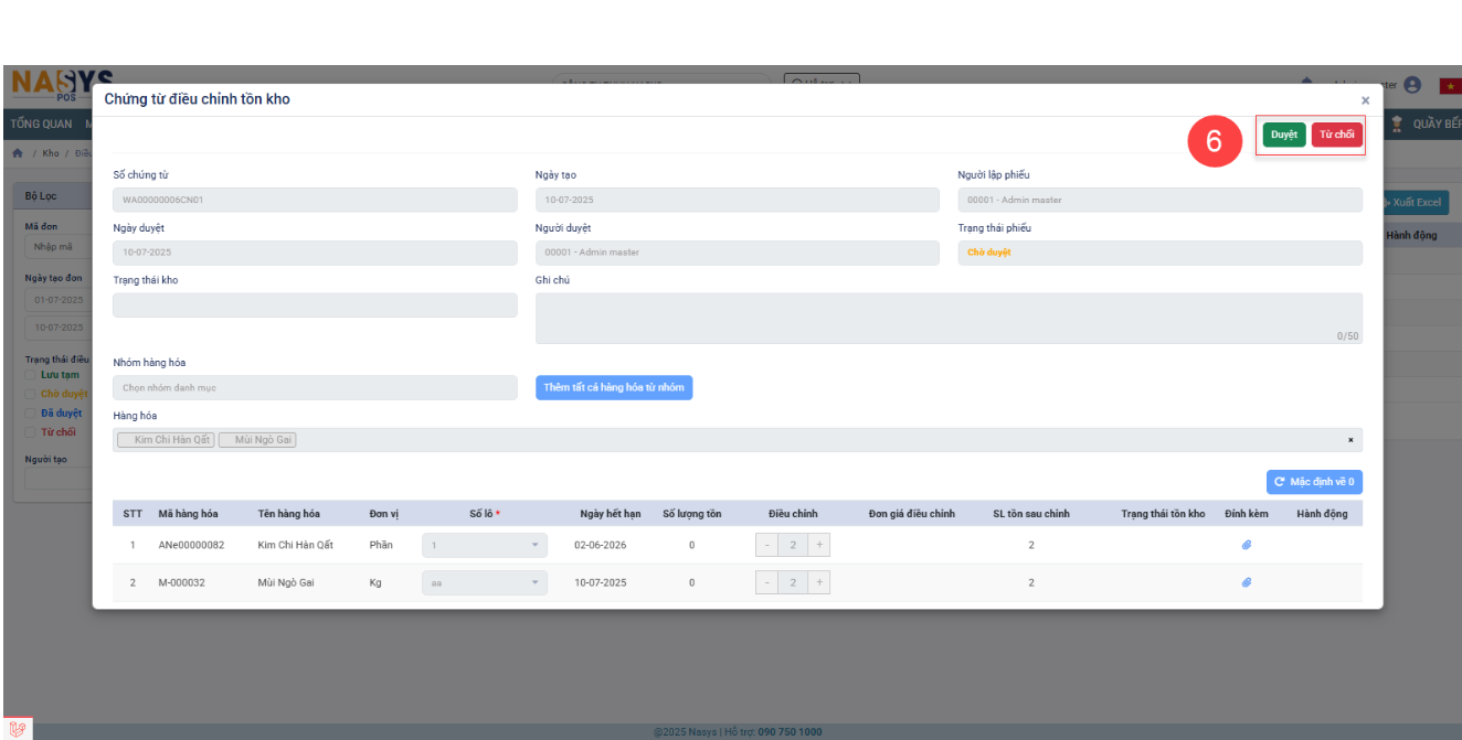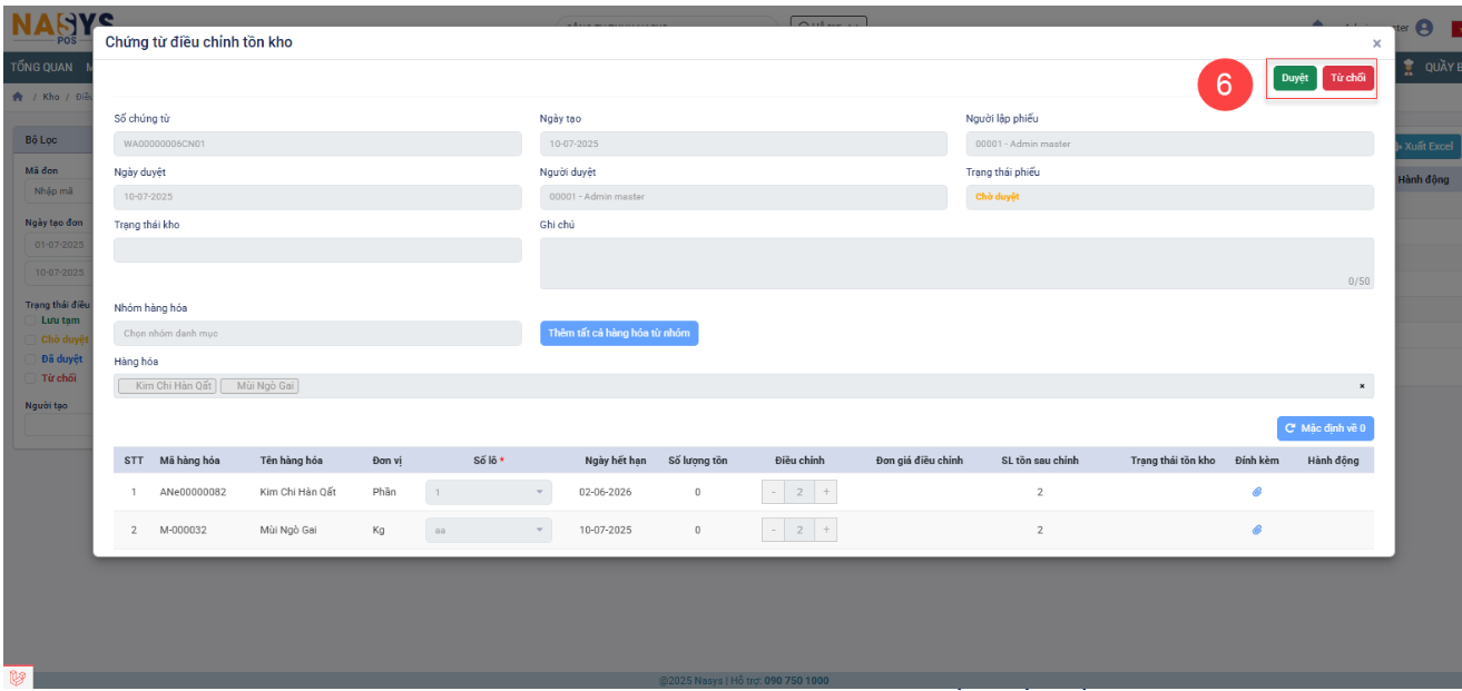 Hình minh họa thực hiện duyệt/ từ chối phiếu điều chỉnh