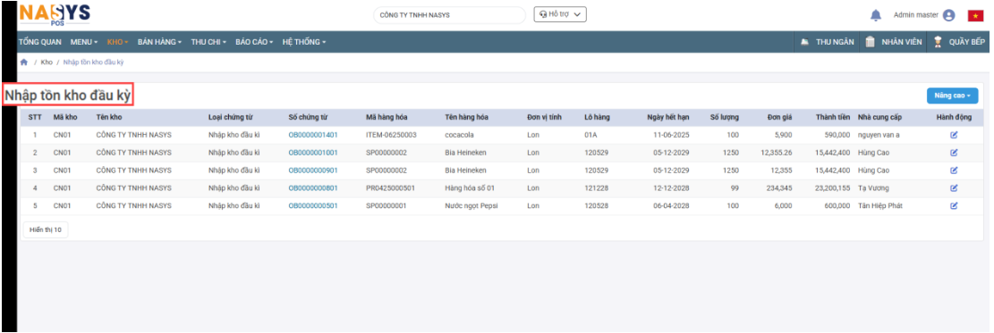 Truy cập menu Kho > Nhập tồn kho đầu kỳ