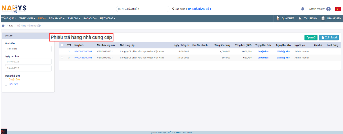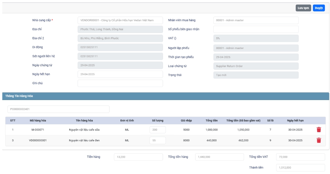 - Duyệt: Số liệu hàng hóa tồn kho đã được “Duyệt” và xử lý xuất kho. Trả hàng lại cho nhà cung cấp.