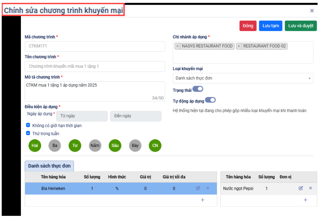 - Lựa chọn các thứ hiệu lực: lựa chọn các ngày, thứ hiệu lực cho chương trình khuyến mại mong muốn.