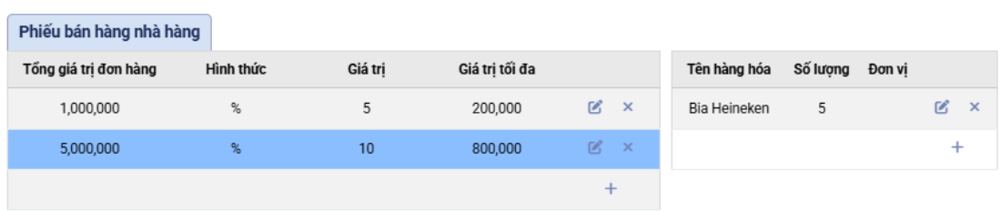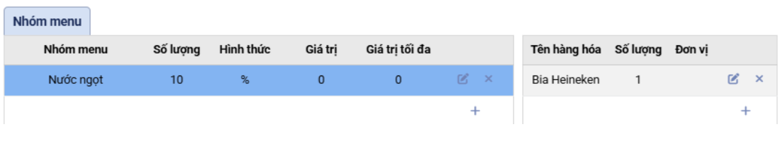 + Đơn hàng: Khách hàng sử dụng nước uống ở nhóm hàng hóa “Nước ngọt” đủ số lượng hàng hóa 10. Hệ thống sẽ tặng 01 lon Bia Heineken.