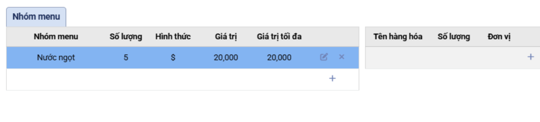 + Đơn hàng: Khách hàng sử dụng nước uống ở nhóm hàng hóa “Nước ngọt” đủ số lượng hàng hóa 5. Hệ thống sẽ giảm giá tiền cố định 20,000 nghìn cho tổng số lượng hàng hóa thuộc ngành hàng trên.