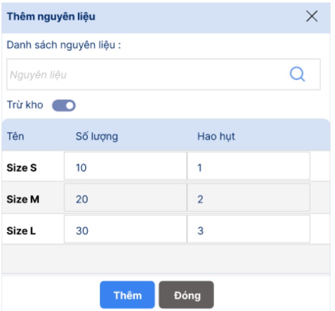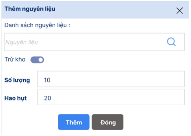 Trừ kho: tick vào để đánh dấu nguyên vật liệu này sẽ được trừ kho khi sử dụng.