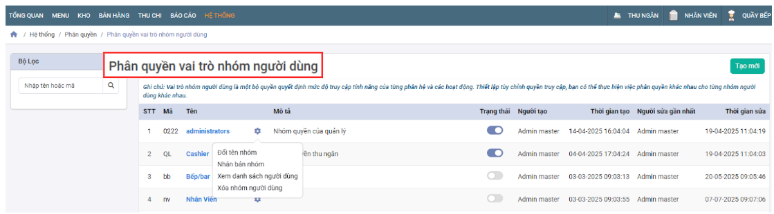 HỆ THỐNG --> PHÂN QUYỀN--> PHÂN QUYỀN NHÓM VAI TRÒ