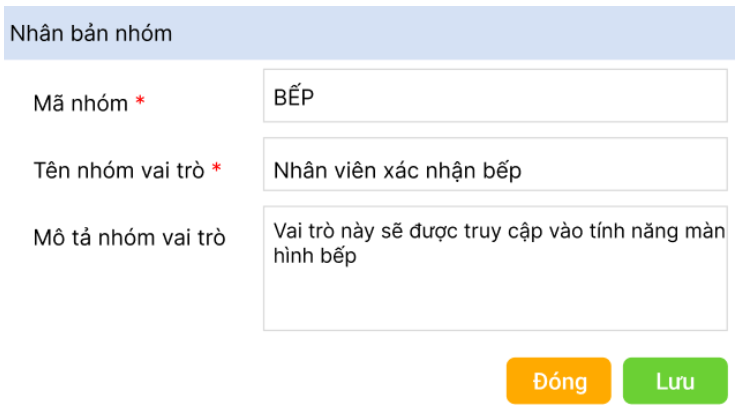 Khi thực hiện tao tác nhân bản nhóm vai trò, cho phép người dùng thực điện đổi (Mã nhóm/Tên nhóm/ Ghi chú mô tả)