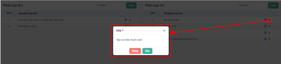 - Xóa: Chọn X, popup hiển thị xác nhận, chọn “Xóa” để xóa thu chi tương ứng