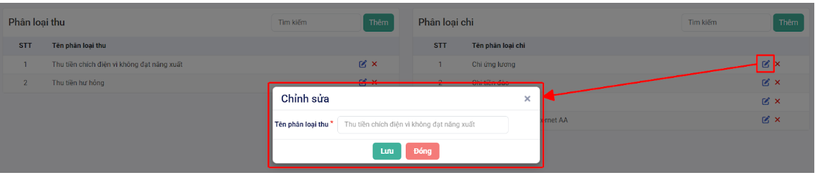 - Điều chỉnh: Chọn *, popup hiển thị thông tin thu chi tương ứng và NSD điều chỉnh thông tin, chọn “Lưu” để cập nhật thông tin