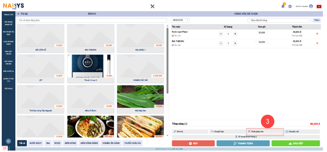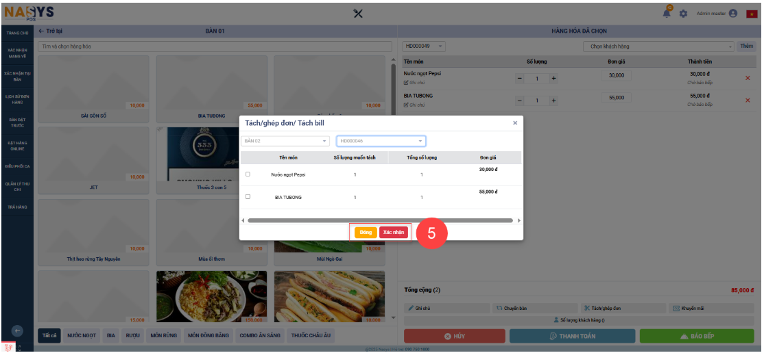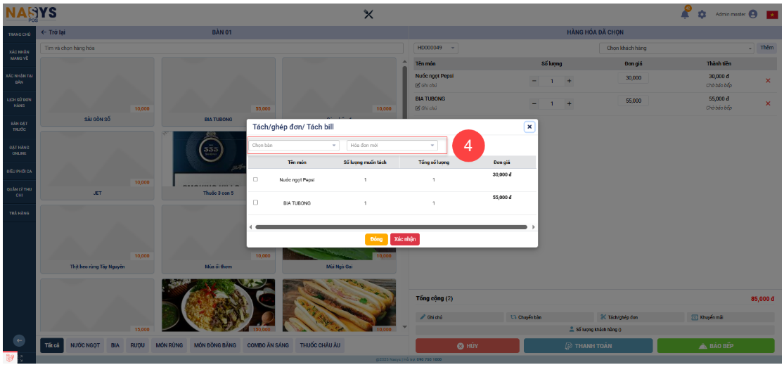 Chức năng cho phép thu ngân thực hiện tách/ghép đơn thành 1 đơn hoặc nhiều đơn